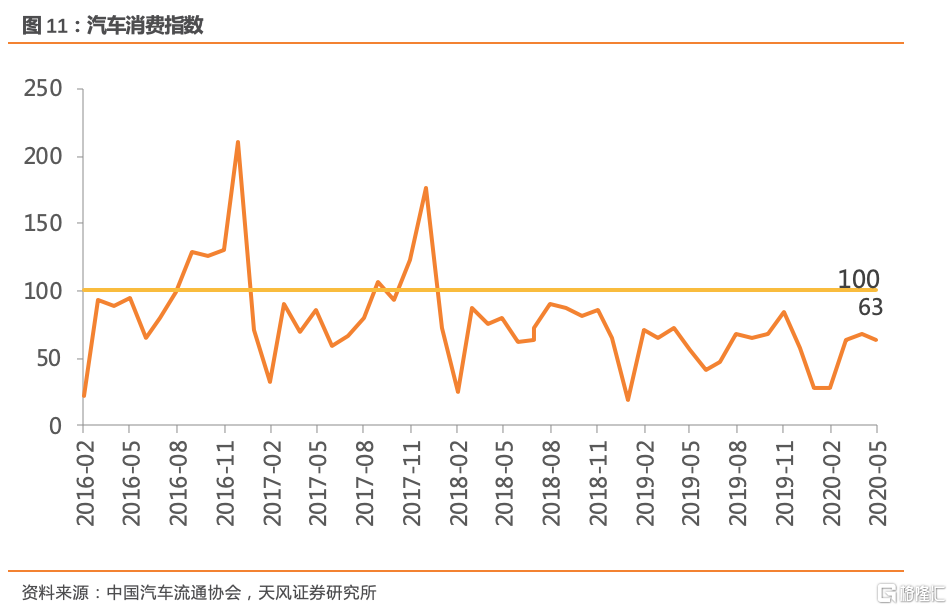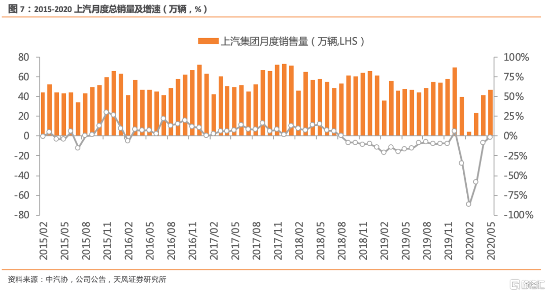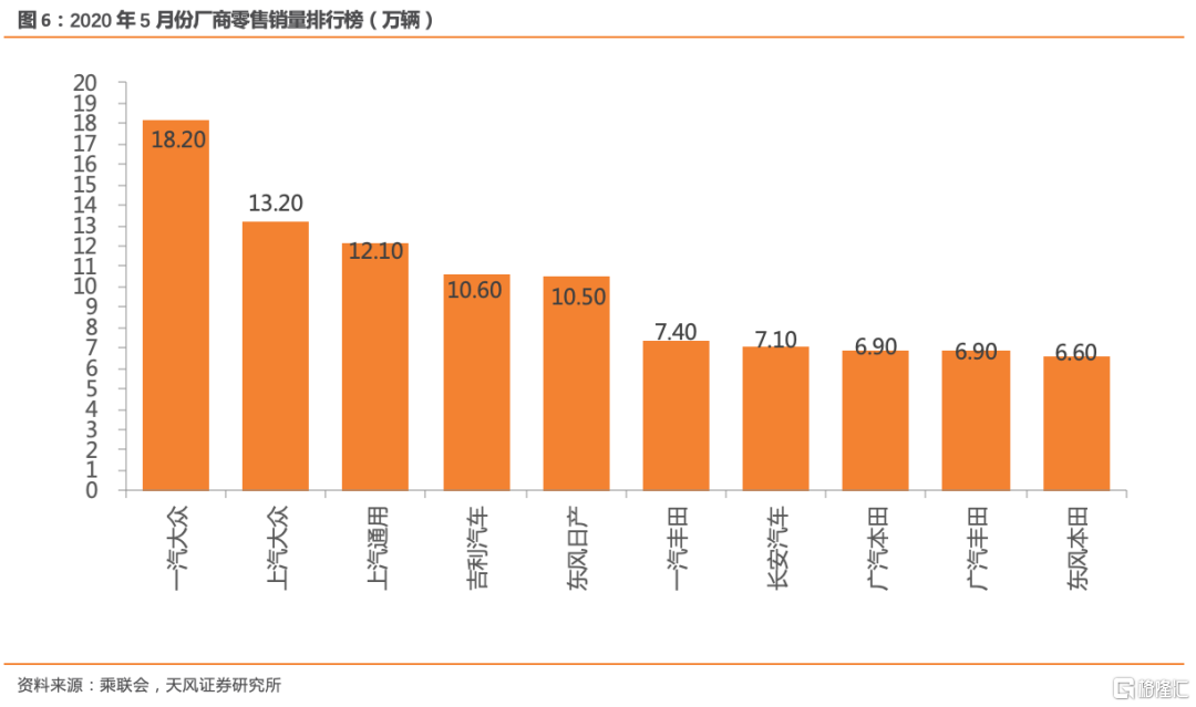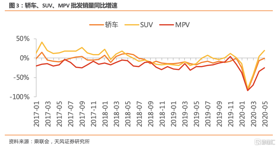 5月乘用车销量同比转正,V型反转趋势延续。2月车市受新冠肺炎疫情影响,当月乘用车销量同比下滑近八成。3月以来,随着国内疫情逐步缓解,各地复产复工有序推进,加之疫情后刚性购车需求逐步释放,4月及5月车企及经销店经营已基本恢复正常状态。1至5月乘用车零售销量同比增速分别为-21%、-79%、-40%、-3%和+2%,3月和4月的同比增速拉升均接近40个百分点,5月同比增速继续上行并转正,延续了疫情以来车市从谷底V型反转复苏的良好态势。