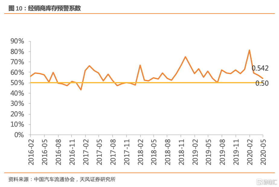 5月经销商库存预警指数回落至54.2%,消费指数63.0。据中国汽车流通协会,5月经销商库存预警指数54.2%,环比下降4.6个百分点,同比上升0.4个百分点;汽车消费指数63,环比下降6.8%,同比上升12.5%。5月经销商库存预警指数仍位于荣枯线以上,但较前几月已有明显改善。6月汽车消费指数63.0,较上月出现小幅回落,或预示6月乘用车销量较5月将出现一定回落。
