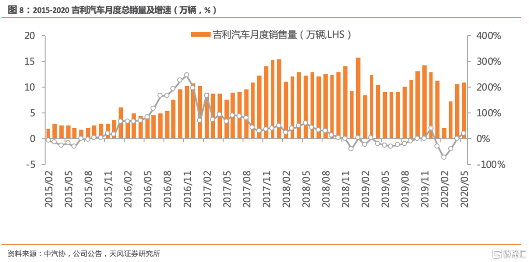 吉利汽车发布5月产销快报:4月销量10.9万辆,同比+20.5%,环比+3.2%。