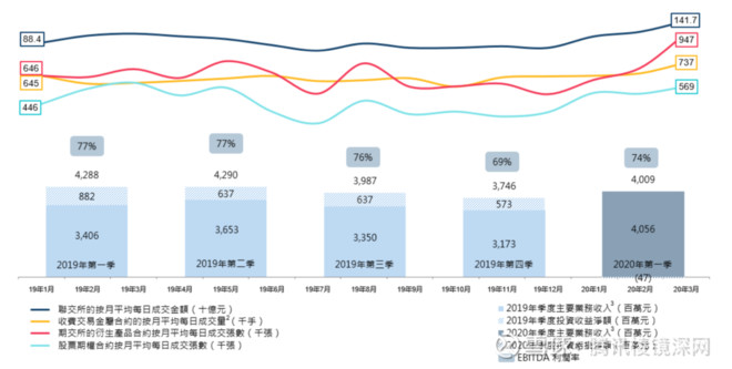 第二是期货交易所,也就是香港期货交易所有限公司(期交所),提供期货、期权交易服务。2019财年,期交所成交合约2.6亿张。
