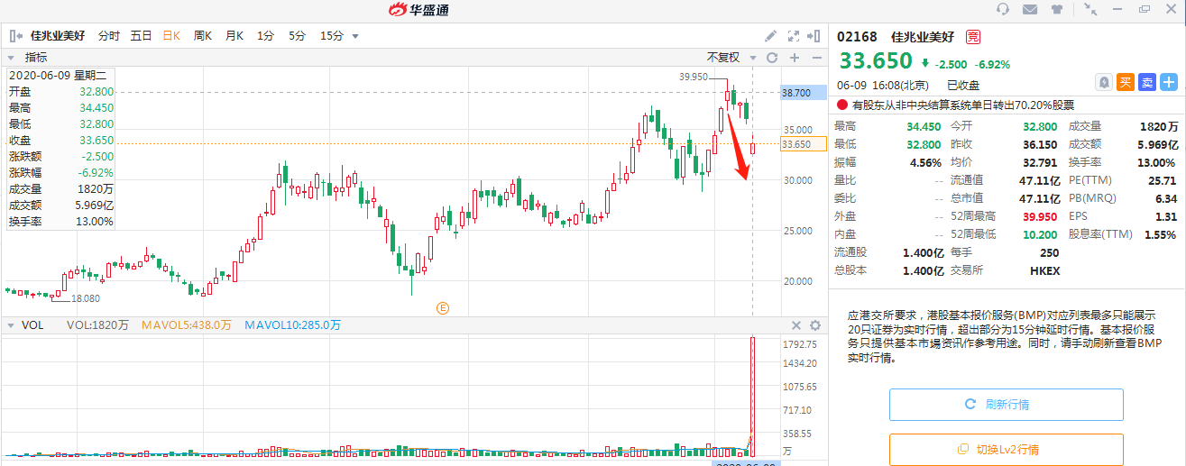 在6月9日早间物业管理公司佳兆业美好,开盘一度大跌超过9%,股价报32.8港元。而距离此前股价高点39.95港元,股价回调幅度已达到18%。而截至6月9日中午收市,佳兆业美好半日成交量已超1680万股,成交金额超5.5亿港元,相较于前一个交易日的3000万港元成交额,半天就多了超过16倍!