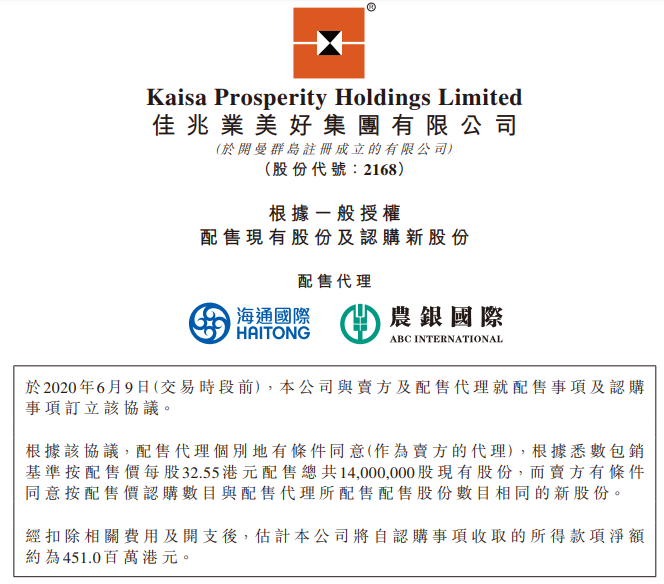 佳兆业美好公告显示,公司将按配售价每股32.55港元配售总共1400万股现有股份,配售价较6月8日在收市价36.15港元折让约9.96%,扣除相关费用和开支后总筹资为4.51亿港元。