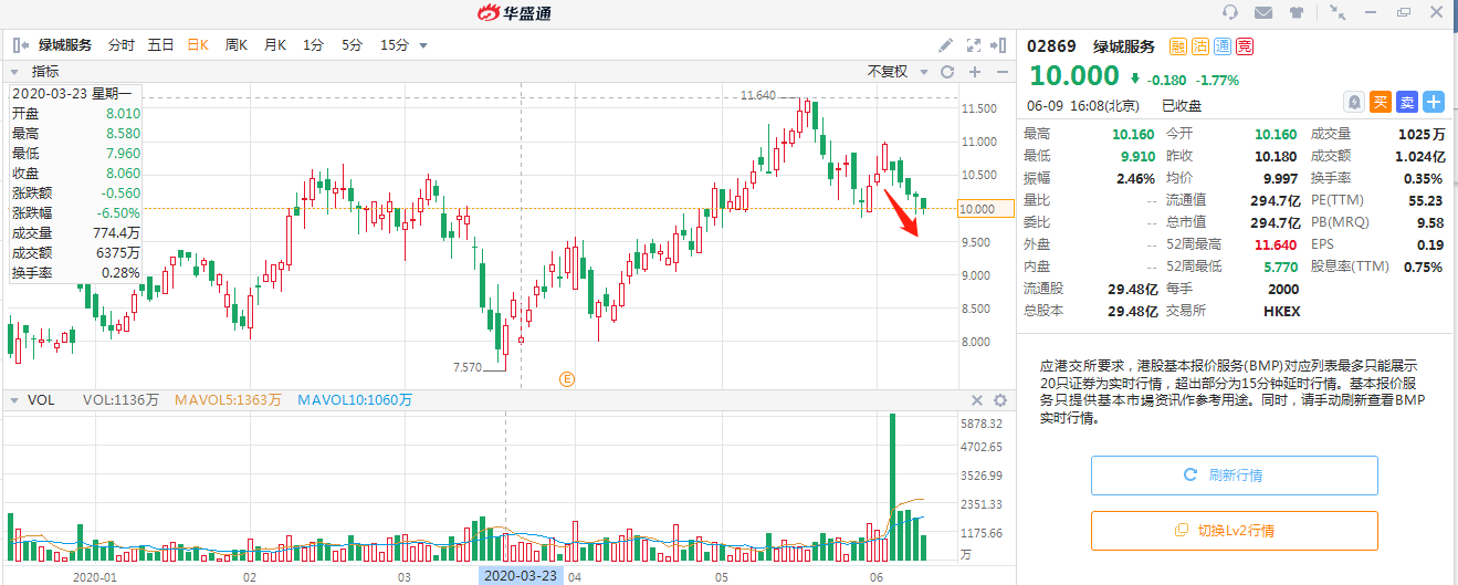 而在6月3日,此前市值超300亿港元的绿城服务也宣布以每股10.18港元(相较6月2日收市价折让约7.12%)配售2.67亿股;配售事项完成后所得总额为27.14亿港元。在宣布配售事项后,绿城服务股价同样走出5连阴,累计下跌近10%。