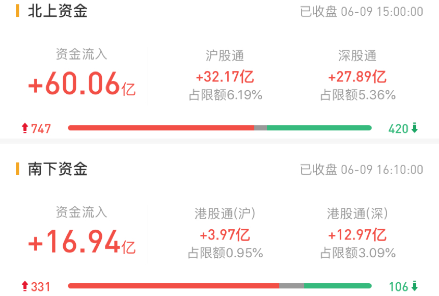 北上资金今日净流入60.06亿元。