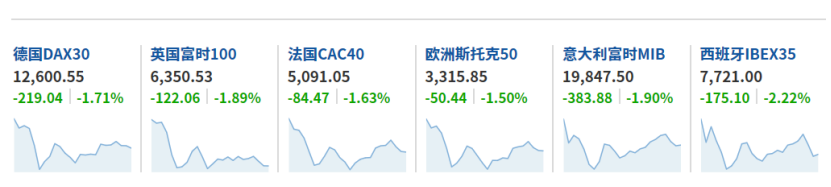 截止发稿,德国DAX指数下跌超1.7%,英国富时100、意大利富时MIB皆跌超1.8%,法国CAC40指数则跌1.63%%,欧洲斯托克50指数则下跌1.5%,而西班牙IBEX35则跌超2%。