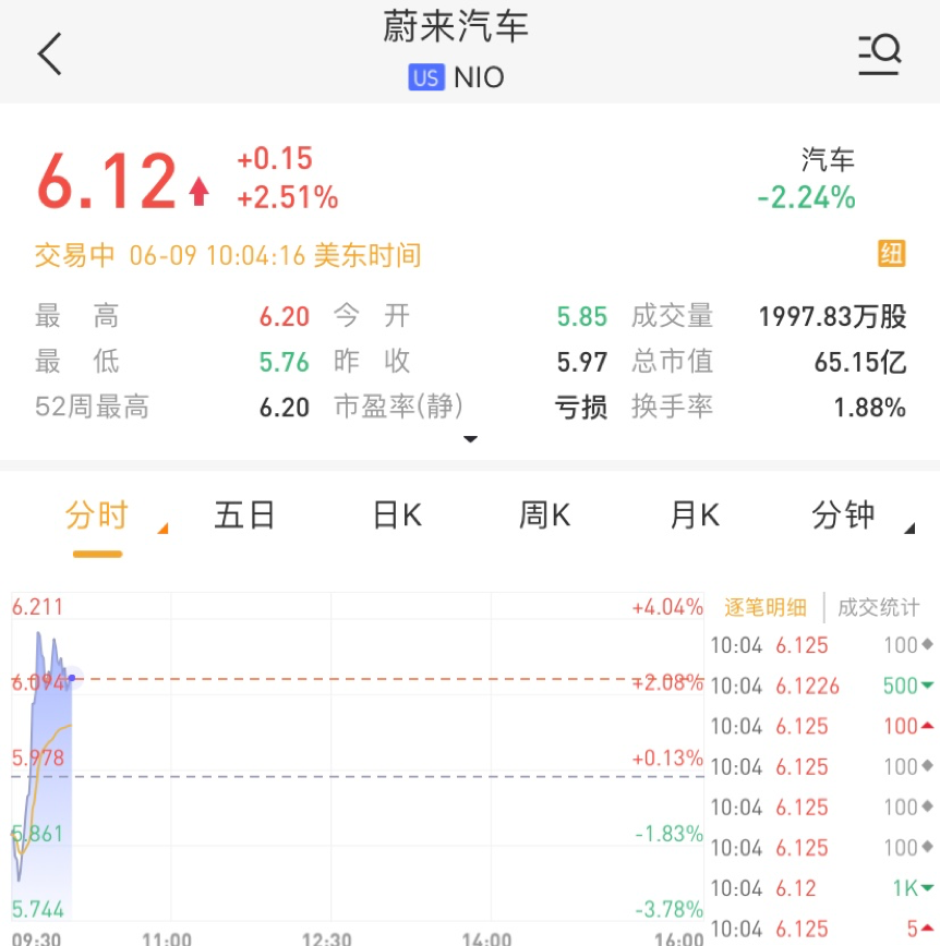华盛资讯6月9日讯,蔚来汽车盘中一度涨近4%,此前蔚来称“EC6爆炸”传闻不属实。截止发稿,蔚来汽车涨2.51%,报6.12美元,当前换手率为1.88%。此前,乘联会数据显示,中国汽车单月销量已连续4个月攀升,同比增速则是时隔11个月后重回正增长。
