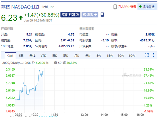 新浪科技讯 6月9日晚间消息,荔枝涨超30%,市值达2.85亿美元。