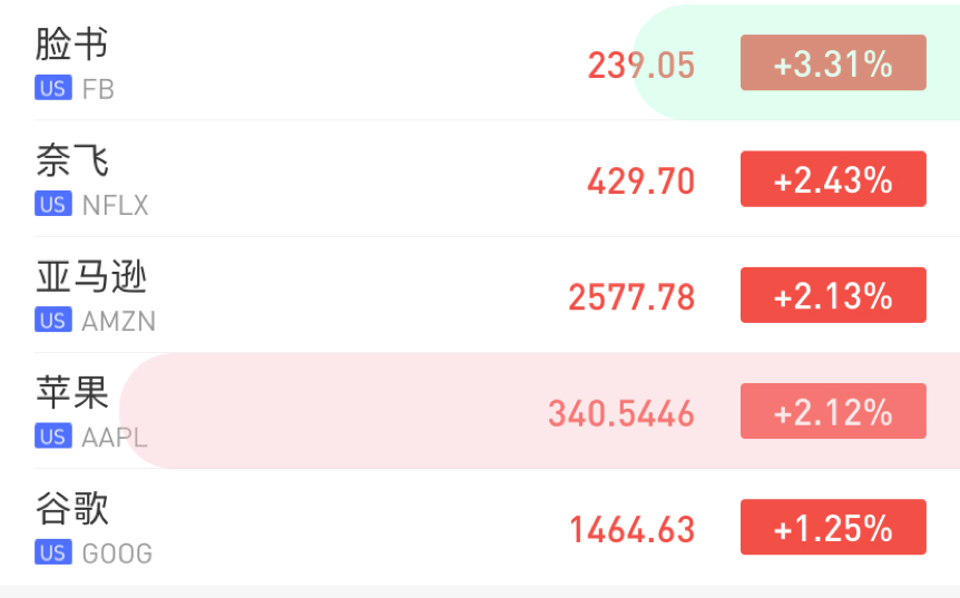 截止发稿,脸书大涨超3%,奈飞、亚马逊、苹果均涨超2%,谷歌亦涨1.25%。