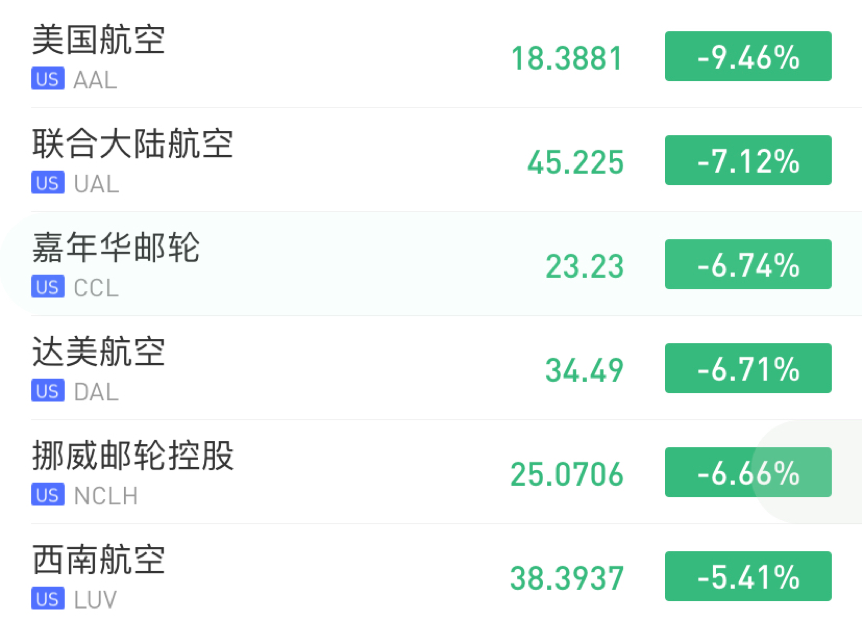截止发稿,美国航空跌近10%,西南航空、达美航空、联合大陆航空均跌超5%;嘉年华邮轮、挪威邮轮控股均跌近7%。