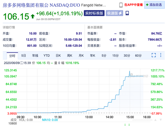 北京时间6月10日消息,中概股房多多周二盘中因涨跌幅波动异常数次交易暂停,截至发稿仍处于暂停交易状态,涨幅达到惊人的1016.19%,现报106.15美元。