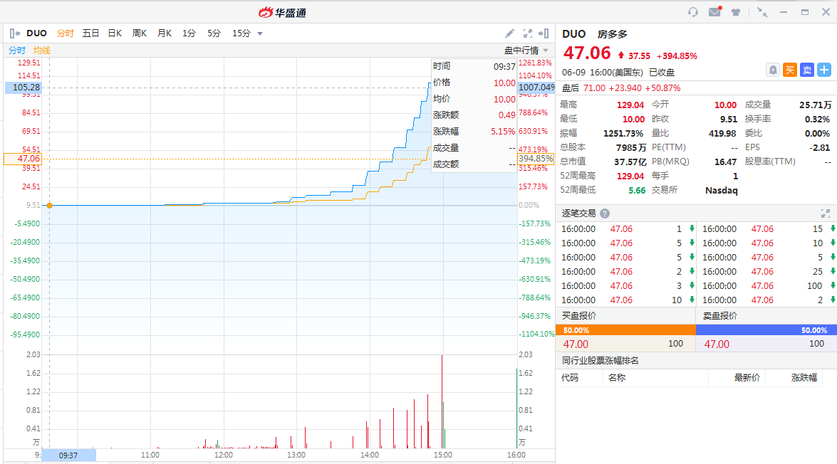 在尾盘接近一个小时的暂停交易后,房多多打开熔断,股价瞬间跳水,截止收盘股价为47.06美元,较开盘上涨394.85%。盘后交易中仍下跌36%。