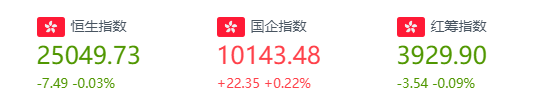 周三恒生指数开盘涨0.49%,全天震荡下跌。截至收盘,恒生指数跌7.49点或0.03%,报25049.73点,全日成交额达1272.55亿。国企指数涨0.22%,报10143.48点,红筹指数跌0.09%,报3929.9点。