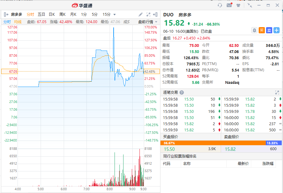 6月10日,房多多则从涨到熔断,迅速发展到跌到熔断,开盘一度暴涨46%,触及熔断;随后跳水转跌,最多跌64%,截至收盘,暴跌了66.38%。房多多公布Q1财报,公司一季度营收2.72亿元,同比下降58.5%;归母净利润亏损1.36亿元,去年同期亏损5143.9万元。公司预计二季度营收在6.6-7.2亿元之间。
