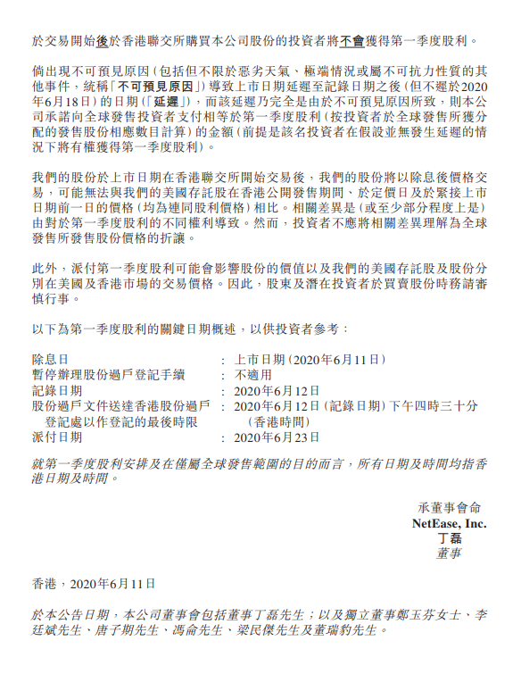 网易将派付第一季度股利,港股股份将以除息后价格交易