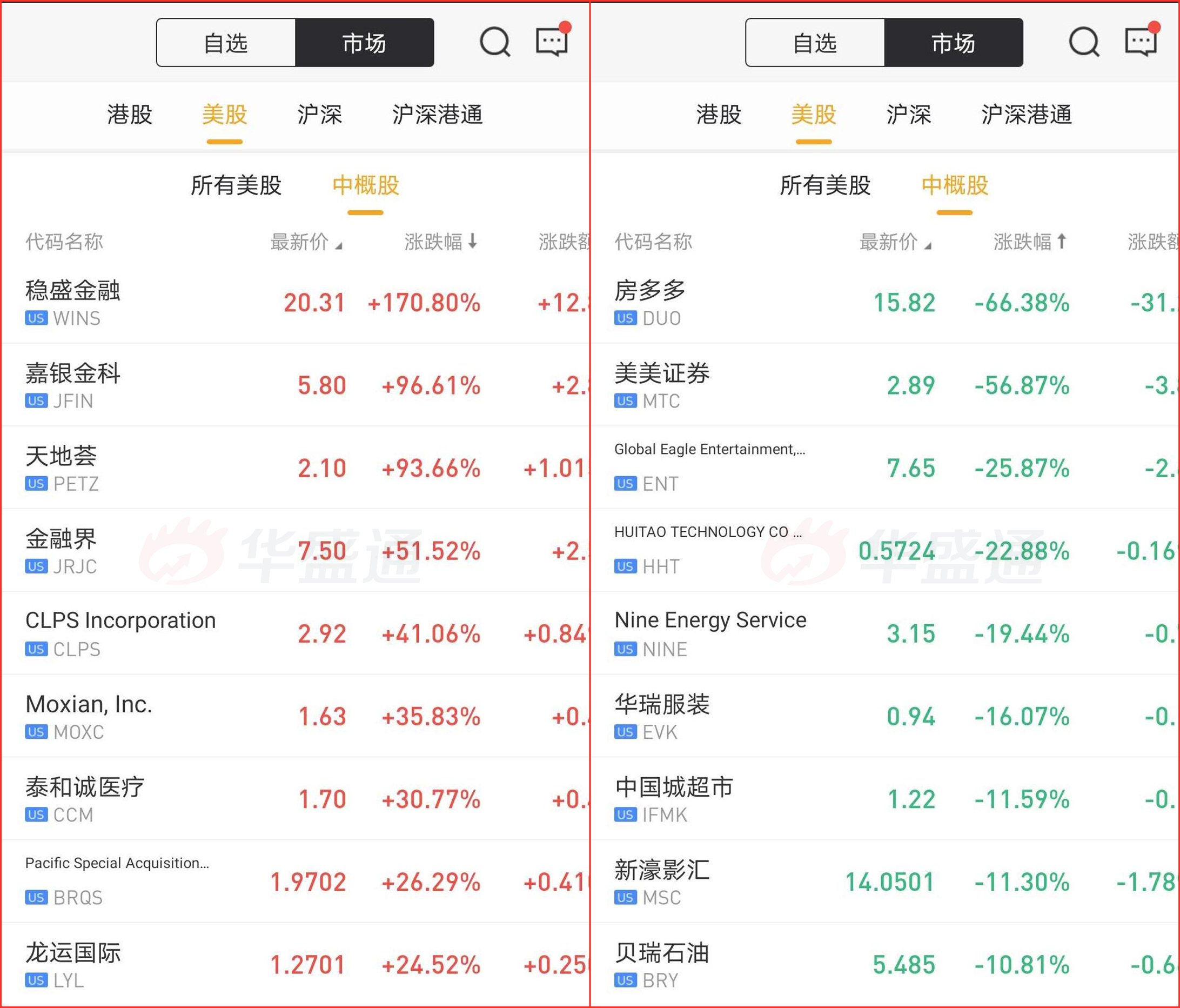 值得注意的是,在美上市的多只中概股周三成交量激增几十倍,走势普遍大幅冲高回落,盘中共触发了超过100次熔断。其中,稳胜金融54次触发熔断,房多多23次触发熔断,嘉银金科8次触发熔断,金融界10次触发熔断,普益财富6次触发熔断。