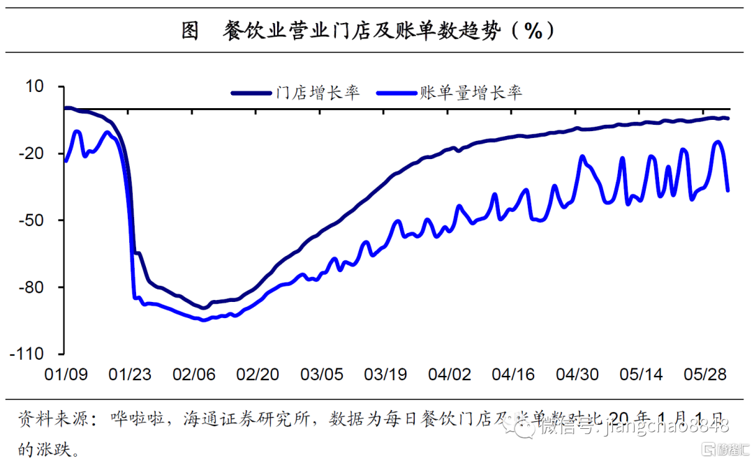 餐饮:门店基本开业,账单七到八成。服务消费特别是依赖于线下接触式的消费,在疫情期间所受冲击最为严重,随着管控措施的放松,这部分消费也呈现出复苏的态势,但进度上要落后于商品消费。以餐饮业为例,根据哗啦啦对其在线服务的全国15万家餐饮商户所做的统计,截至6月7日,餐饮门店营业率已经恢复至96%以上,但根据账单量的情况来看,仅相当于疫情前正常时期的七到八成水平。
