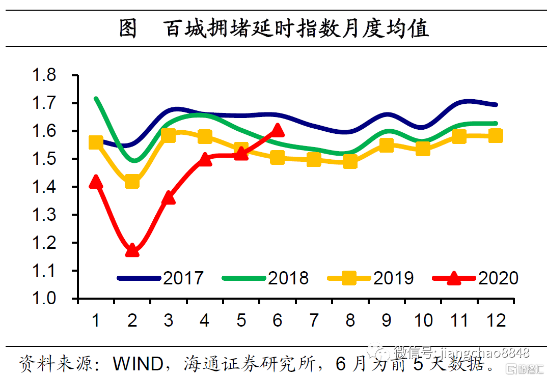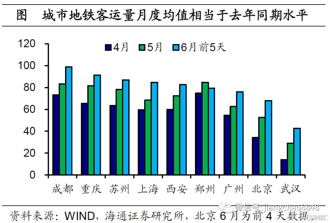 拥堵重现地铁迎客,市内交通基本恢复。从城市内部的交通流量来看,一方面,市内道路交通拥堵程度开始上升,根据高德发布的百城拥堵延时指数,5月均值达到1.52,较19年5月的1.53非常接近,而6月前5天均值更是升至1.60,远超过18年和19年同期水平;另一方面,主要城市地铁客流也有明显恢复,在我们统计的9个城市样本中,多数城市5月地铁客流量均值能达到19年同期的七至八成,6月更是进一步提高到八至九成。综合来看,考虑到疫情导致私人交通对公共交通的部分替代,可以认为城市内部交通已经基本恢复到去年同期水平。