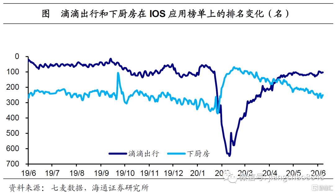 应用榜单排名变化,印证出行恢复到位。通过观察相关APP使用情况的变化也能够印证人们出行活动的恢复。疫情前的19年底,滴滴出行在IOS应用榜单上的排名基本能够维持在前150名,而疫情期间由于出行活动受阻,其排名严重下滑,最低时候甚至排在600名之外,而相反由于居家活动上升,提供食谱的下厨房APP在IOS应用榜单上的排名由疫情前的300名左右一举上升至前100名甚至前80名之内。随着疫情逐渐得到控制,两者在榜单上的排名又分别向疫情发生前的情况靠拢,6月滴滴出行恢复到了100名左右的位置,和疫情前大体相当,下厨房又下滑到了大约250名的水平。