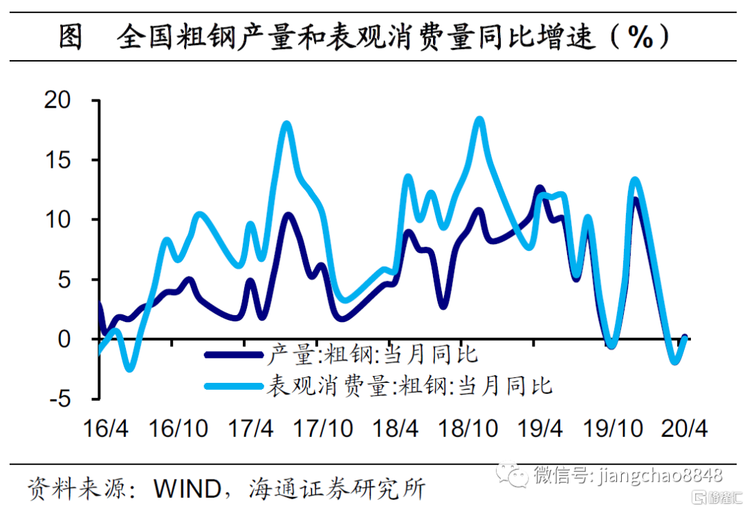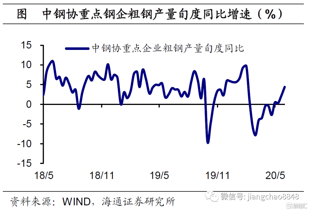 钢铁:产量超过去年同期,受创程度小于下游。钢铁行业是重要的原材料工业之一,其生产情况一定程度上反映了工业的整体面貌。疫情发生以来,钢铁生产诚然受到了不小的影响,但是受创程度相对要小于下游行业。全国粗钢产量增速仅3月录得负增长,4月又迅速回升转正,表观消费量增速4月也接近归零,意味着产销大体和去年同期相当。根据中钢协对重点钢企的统计,5月重点钢企粗钢产量增速由负转正至2.3%,Mysteel调研统计的样本钢厂钢材产量增速持续回升,6月第一周增速也有转正,均指向当前钢铁行业产量已超过去年同期。