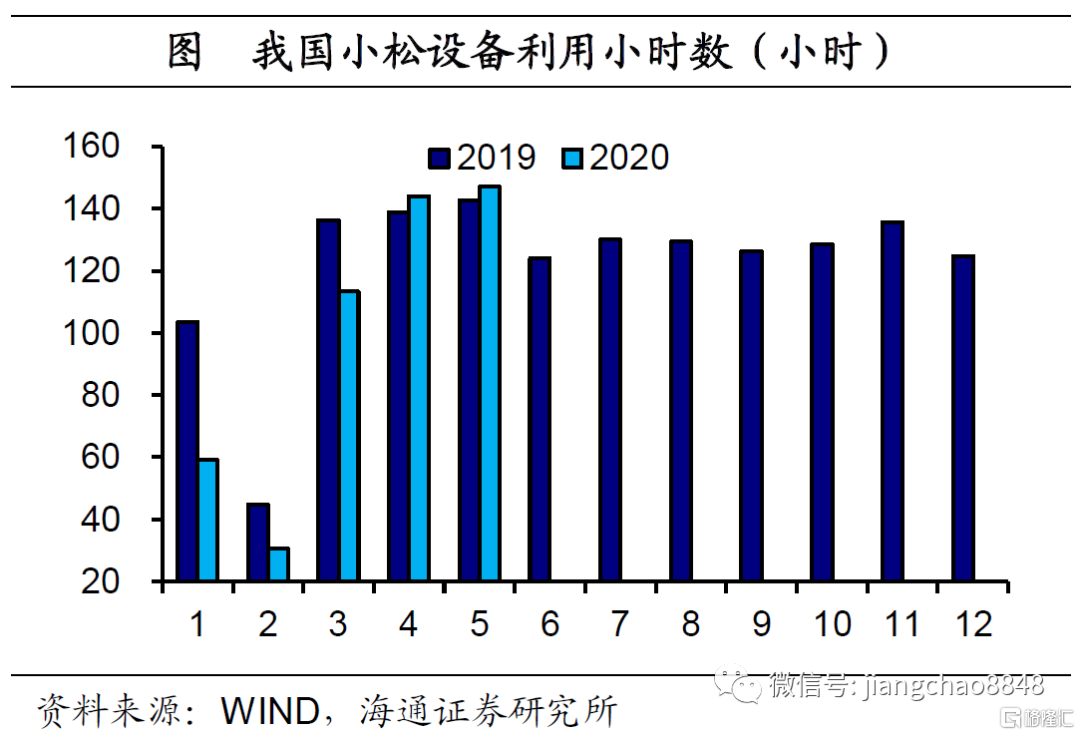 工程机械:行业需求强势复苏,疫情过后补偿增长。工程机械是装备制造行业的重要组成部分,下游需求主要集中在建筑业,同地产、基建等项目的施工联系紧密。而在疫情严重期过后,机械行业需求迎来了强劲反弹。一方面,产品销售增速屡创新高,3月挖掘机销量同比增速即由负转正至12%,4月销量增速更是跳升至60%,5月继续升至68%,前5月累计销量已达19年同期的1.2倍;另一方面,设备利用时间也有所提升,5月我国小松设备利用小时数为147小时,不仅高于19年同期水平,也是自18年11月以来的新高。