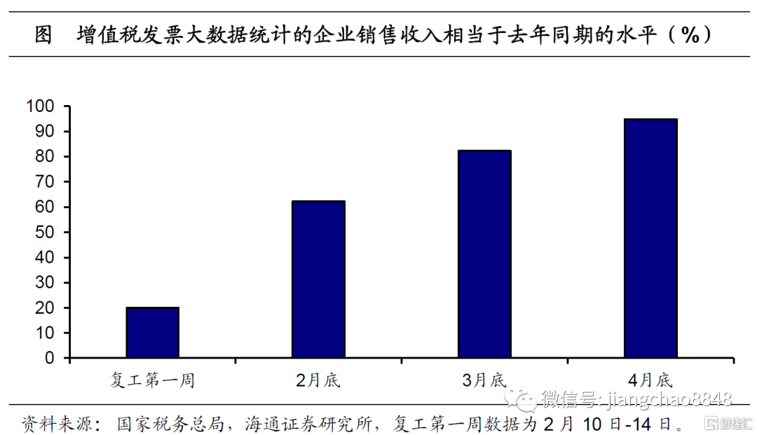 需求限制解除,恢复速度较快。在疫情后经济活动刚开始恢复的时期,我们曾经在研究报告中指出“当时下游的经营活动还未正常展开,需求受限在很大程度上制约了生产的扩张”。而随着限制措施的逐步解除,需求端从整体上来看,保持了较快的恢复速度。根据国税总局基于增值税发票大数据所做的统计,复工第一周的企业销售收入仅相当于19年同期的20%,而2月底就已经超过60%,4月底更是接近95%,较去年同期可比水平相去不远。