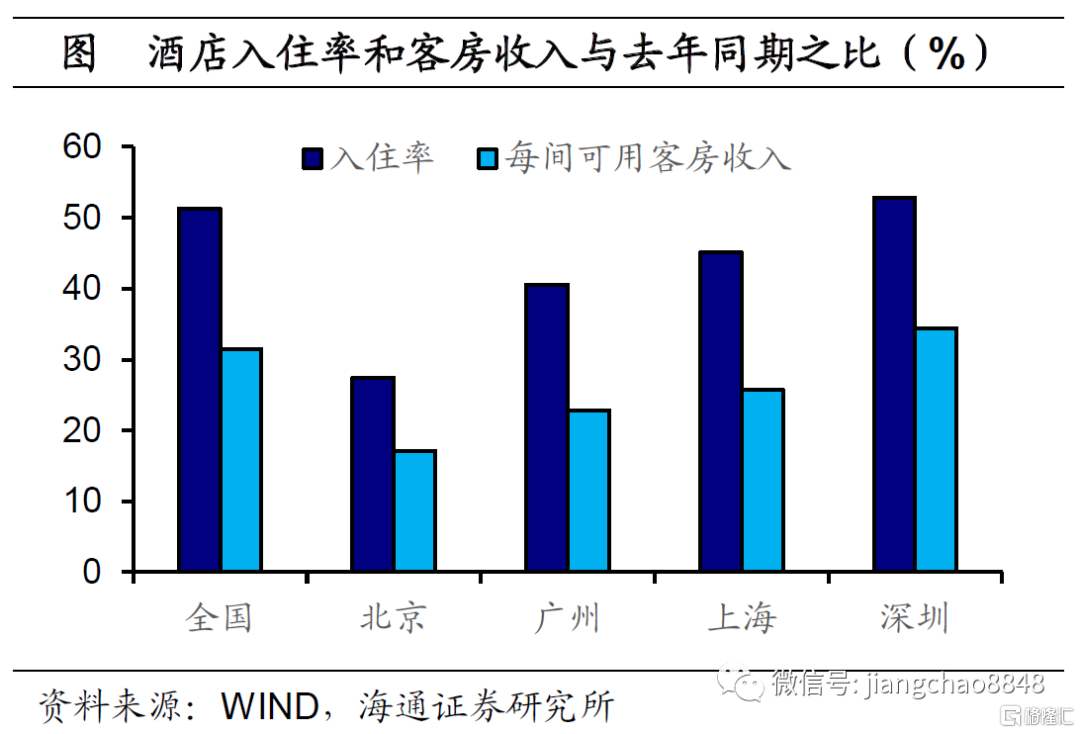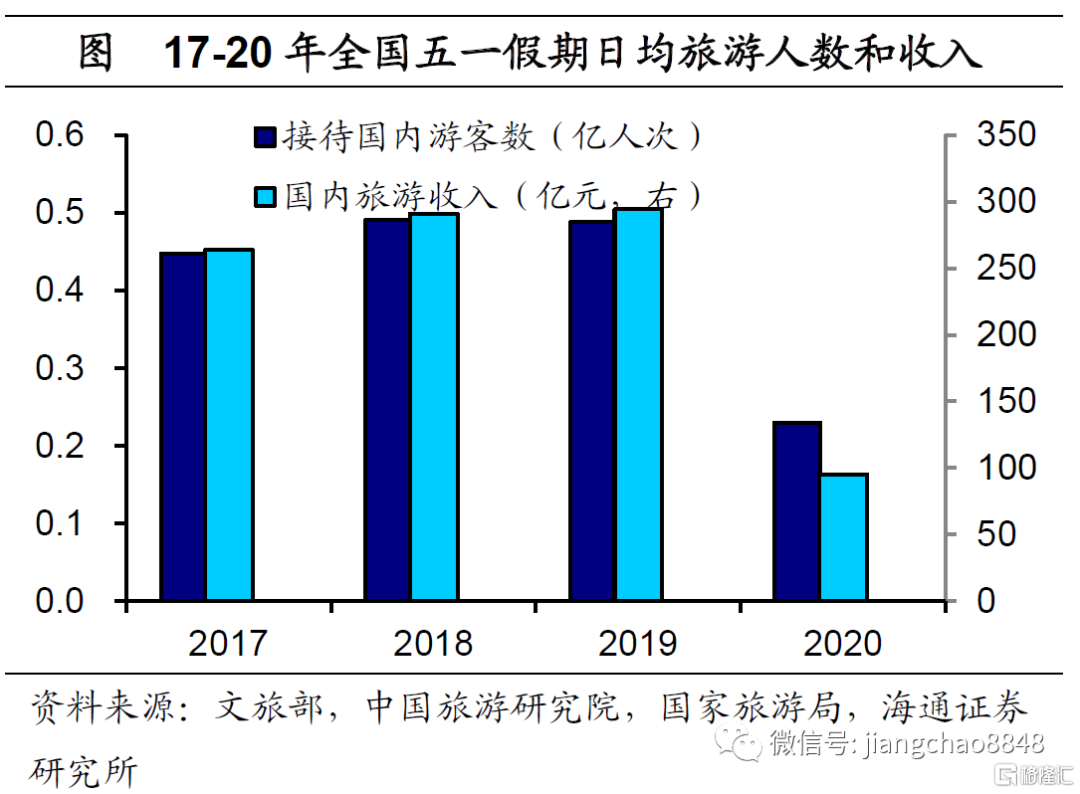旅游酒店:收入仅达同期三成,恢复进度相对迟缓。旅游需求通常在假期得到集中释放,因此刚刚过去的五一黄金周是个很好的观察窗口,根据文旅部的数据,20年五一假期期间我国日均接待国内游客约0.23亿人次,日均实现旅游收入约95亿元,分别只有19年日均水平的47%、32%。旅游行业的疲弱也在一定程度上导致了酒店业的萧条,根据STR所做的统计,4月我国酒店入住率仅相当于去年同期的51%,每间可用客房收入仅有去年同期的31%。