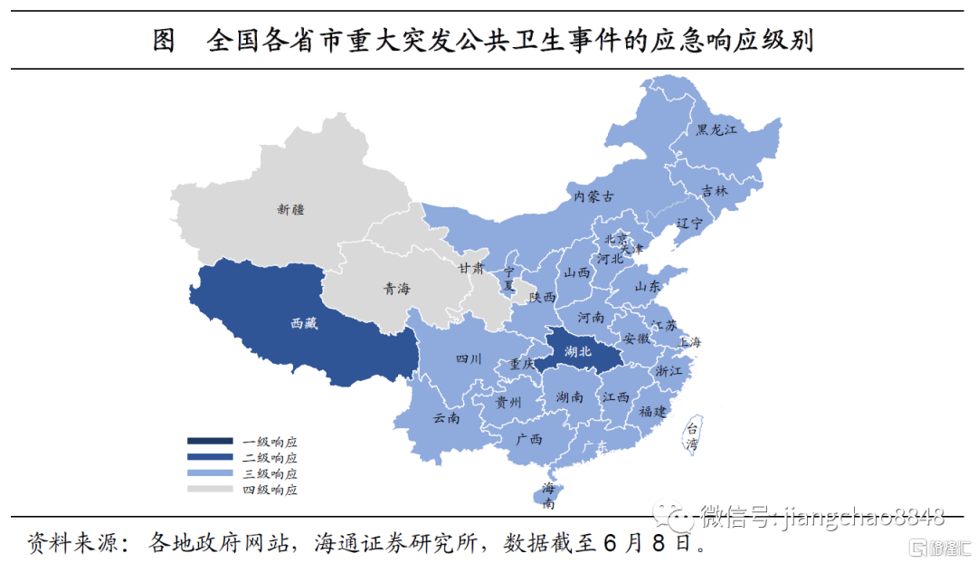 响应级别普遍下调,仅有两省仍处二级。疫情发生以来,各地陆续启动了重大突发公共卫生事件的应急响应,一度全国31个省市均处于一级响应状态。而随着国内本土疫情逐渐得到控制,多省市也相继下调了应急响应的级别,5月2日疫情最为严重的湖北省从一级响应下调为二级响应,自此国内各省市全部结束一级响应状态。截至6月8日,国内仅有2个省份处于二级响应状态,超过九成的省市响应级别均在三级或三级以下,应急响应级别的普遍下调也意味着各项限制措施的减弱。