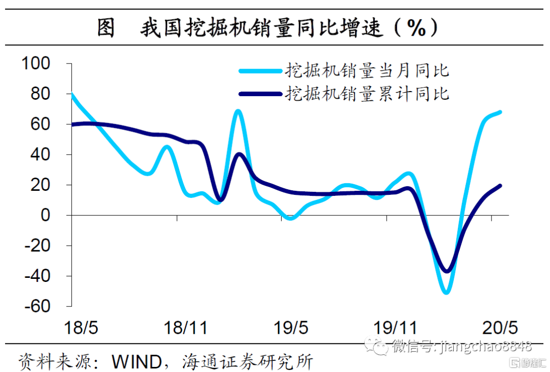 生产普遍不输去年,工程机械强势复苏。从上游行业的恢复看,钢铁:产量超过去年同期,受创程度小于下游。5月中钢协重点钢企粗钢产量增速转正,6月第一周Mysteel样本钢厂钢材产量增速也开始转正,指向当前钢铁产量已超去年同期。