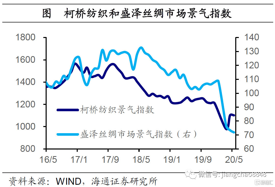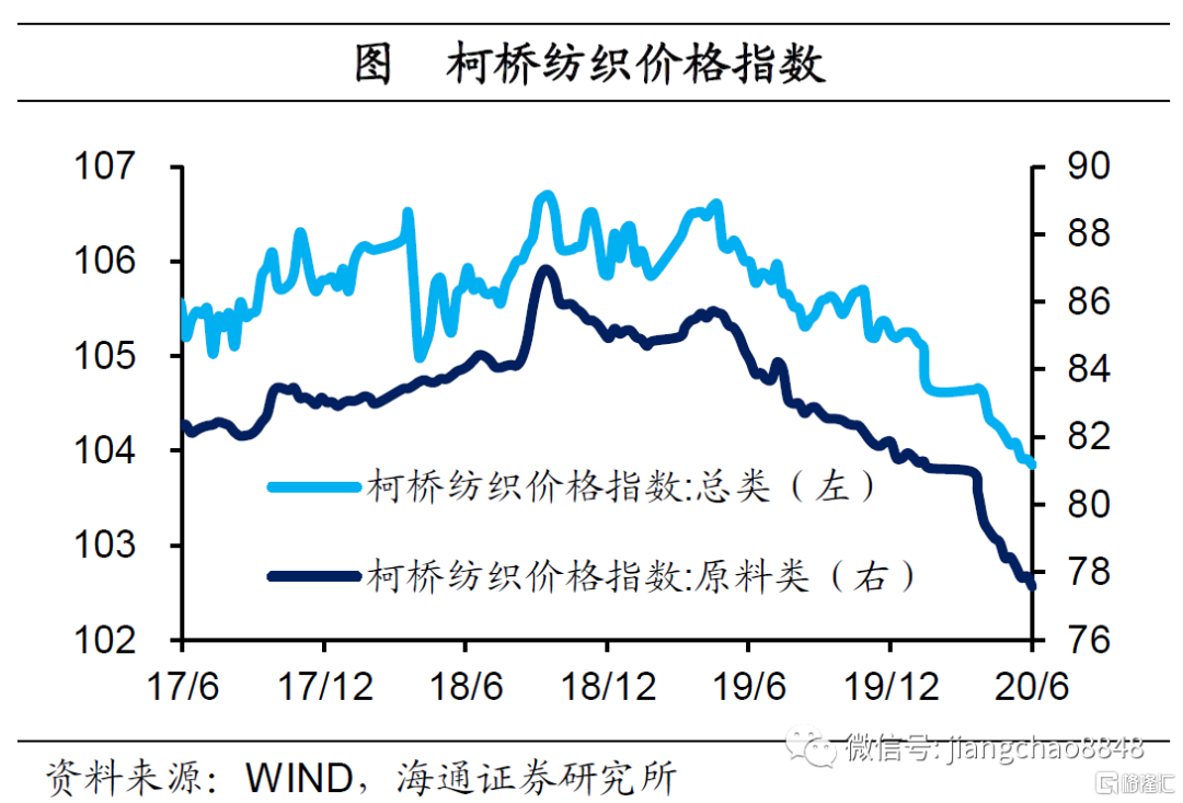 纺织服装:需求恢复并不理想,价格水平创下新低。纺织服装行业在疫情期间也受到了较大的影响,外出活动的减少使得人们装扮类需求显著下降,但是在疫情高峰过后,该行业的需求恢复并不理想。4月限额以上服装类零售额同比增速降幅仍超过-20%,从景气程度来看,柯桥纺织景气指数和盛泽丝绸市场景气指数均表明,5月纺织市场需求仍处低位,且远未达到19年底疫情前的水平。价格的持续下滑也印证了需求疲弱,柯桥纺织价格指数创下近三年以来的新低。
