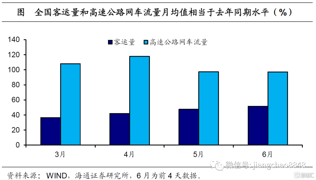 客运仅达去年五成,高速车流并不逊色。从城际间的交通流量情况来看,虽然已较疫情最为严重的时期有明显好转,但全国客运量恢复依然偏慢,3月客运量月均值仅有19年同期水平的36%,5月客运量月均值达到19年同期的47%左右,而6月才刚刚超过50%。可见人们当前仍尽量减少非必要的远距离出行。与此同时,出行方式也有明显变化,驾车出行更受青睐,3月以来高速公路网车流量月均值基本达到甚至超过19年同期水平。