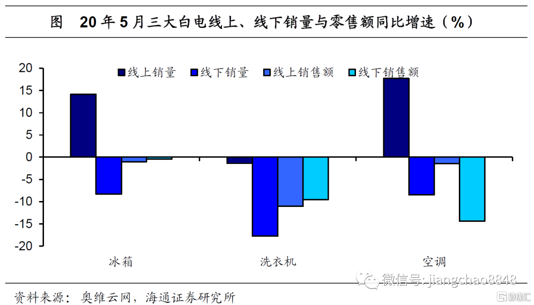 家电:可选消费重要品类,恢复进度慢于汽车。同样作为可选消费占比较大的品类,家电需求恢复进度慢于汽车,5月三大白电线下销量和销售额增速仍处负增长,行业需求尚未达到去年同期水平。