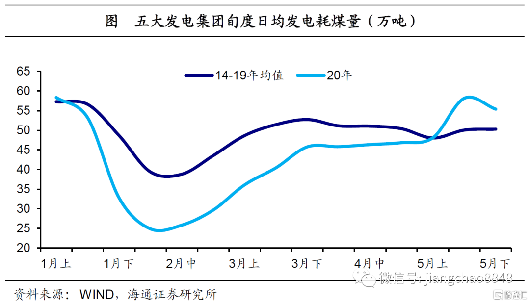 需求恢复较快,生产齐头并进。随着限制措施的解除,需求端整体保持了较快的恢复速度。根据国税总局增值税大数据,复工第一周企业销售收入仅为19年同期的20%,4月底已接近95%。而工业生产与需求“齐头并进”。5月各旬五大集团日均发电耗煤量均高于14-19年同期均值,即便考虑到基数效应,仍然指向工业生产处于较强水平。