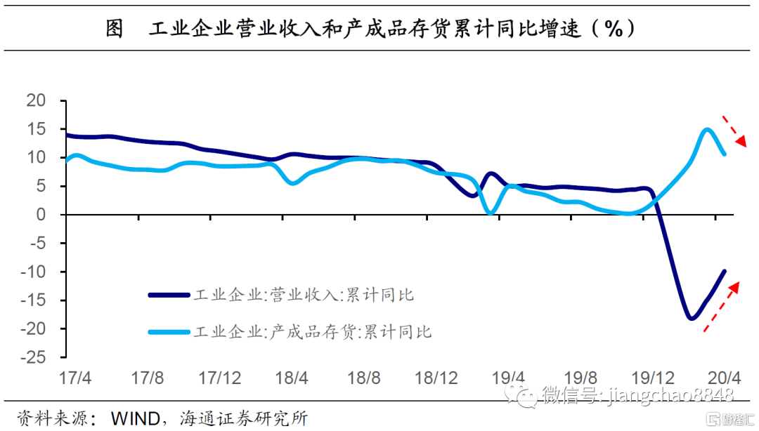 供需衔接顺畅,短期被动去库。疫情之后经济开始复苏的初期,需求低迷一度成为制约生产完全恢复的关键因素。而二季度以来,随着对于需求端的限制逐步解除,供需之间的衔接也变得更为顺畅。从规模以上工业企业情况来看,3月和4月工业企业营业收入累计同比增速降幅持续收窄,而4月产成品存货增速也自高位下滑,工业经济短期呈现出被动去库存的特征。但由于需求的恢复进度整体仍落后于生产,库存水平依然处在偏高位置。