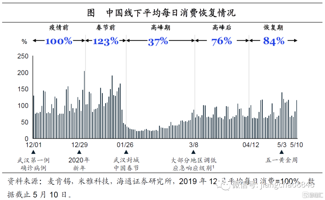 商贸零售:线下零售基本开业,营收恢复八成左右。疫情对商贸零售行业的影响具有非对称性,给线上销售企业带来难得发展机遇的同时,却又使得线下销售受困。麦肯锡对我国3.1万家商户所做的追踪分析显示,疫情高峰期我国日均线下消费不到疫情发生前的40%,其后随着限制措施的放松,经历了较快修复,3月中旬至4月上旬已经恢复到疫情前的76%,5月上旬更是恢复到84%左右。根据商务部监测,截至6月1日零售各业态限额以上企业复工率已超过95%,其确定的11条改造提升试点步行街店铺开业率达到了94.5%,客流量和营业额分别恢复到去年同期的80.3%和81.6%。由此可见,线下零售基本已经完成开业,但是销售额约恢复到去年同期的八成左右。