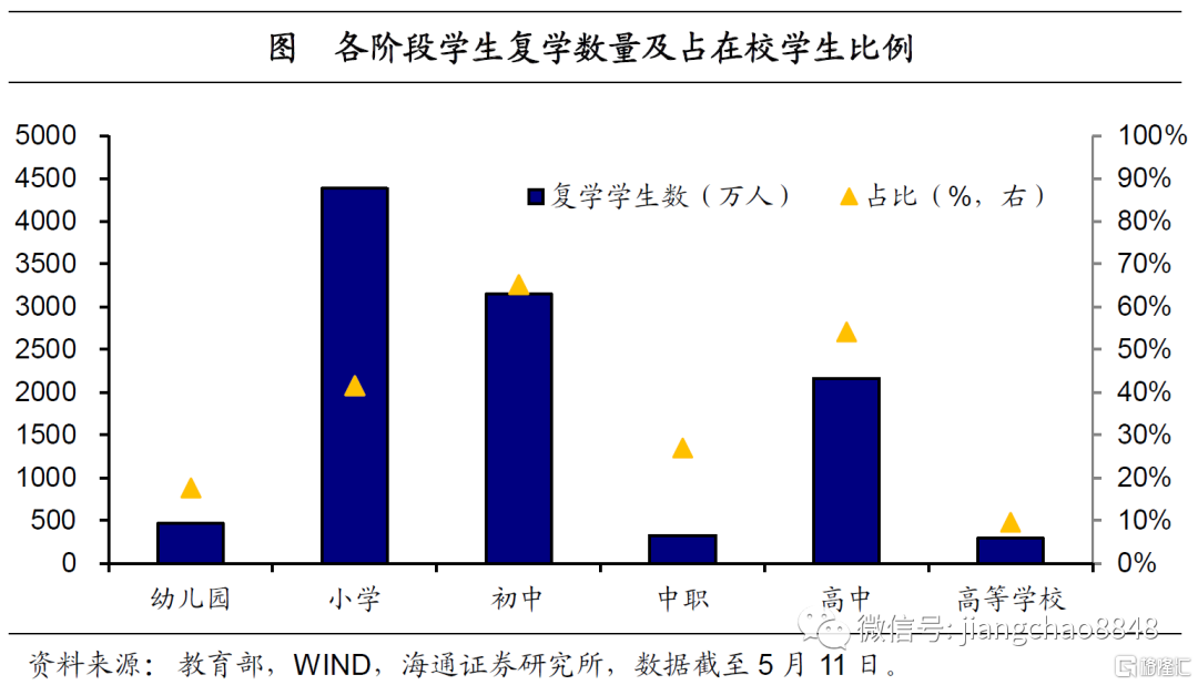 复学全面铺开,六月基本完成。出于安全因素的考虑,在疫情得到控制后的各项恢复工作之中,复学复课一般要晚于复工复产和复商复市,因此,学校线下教学活动的恢复通常意味着大范围和普遍性的隔离措施基本消除,经济和社会生活逐渐回归到正常秩序。根据教育部数据,截至5月11日,全国学生复学人数超过1亿,复学比例接近四成,其中初中和高中返校比例均超过50%。按照各省市所发布的复学时间来看,高等院校除毕业年级外由其自行统筹安排,因而开学情况不一,但除个别省市之外,小、初、高各年级普遍将会在6月完成开学,据我们估计,6月底全国小、初、高复学比例将至少在九成以上。