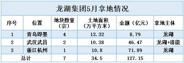 据观点地产新媒体不完全统计,5月,龙湖集团在青岛、武汉、杭州等地购入七宗地块,土地总面积为34.5万平方米,土地金额达到127.15亿元。