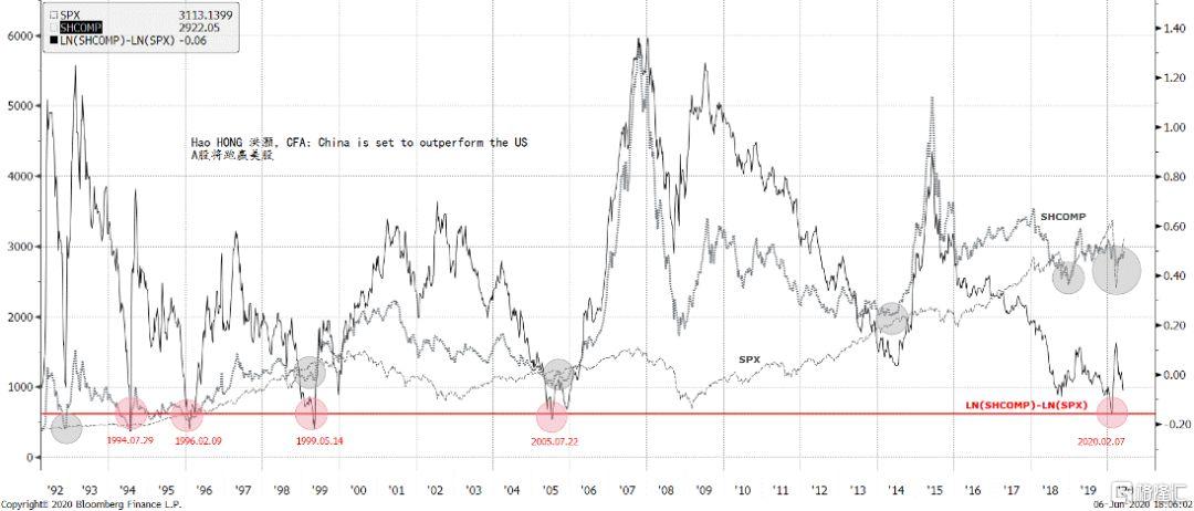 关于上证综指的长期前景,我们在之前的报告里也曾讨论过,今年2月上证综指相对标普500指数的表现再次达到历史极端水平(《亚洲强国:市场运行至一个历史性转折点;中国将开始长期跑赢》,2020.04.20)。虽然这一相对表现是由相对估值推动的,但在对比期开始时,这两个指数的实际指数水平大致都在1000点左右。这个巧合使得比较这两个指数之间的相对表现变得非常方便。上证现在相对于标普如此糟糕的表现意味着这两个指数之间的表现将均值回归,就像历史先例一样,尤其是在2005年上证跌到了1000点之下。因此,长期,上证综指将跑赢标普500指数。长期投资者应该开始关注上证的长期投资价值。