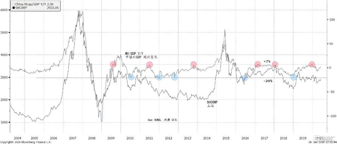 自2008年全球金融危机以来,中国经济一直以7%左右的平均增速扩张。由于GDP是季度发布的,而市值和GDP比率则是根据每日股价计算的,当这个比率的变化超过7%时,就表明市场的增长速度远远快于潜在的经济增长速度。因此,上证综指会遭遇阻力。但当这一比率的变化下降到-20%甚至更低时,就意味着市场已经足够便宜,足以反映出经济的潜在困境,就像2016年初泡沫完全破裂后,以及2018年底贸易战前景恶化时那样。