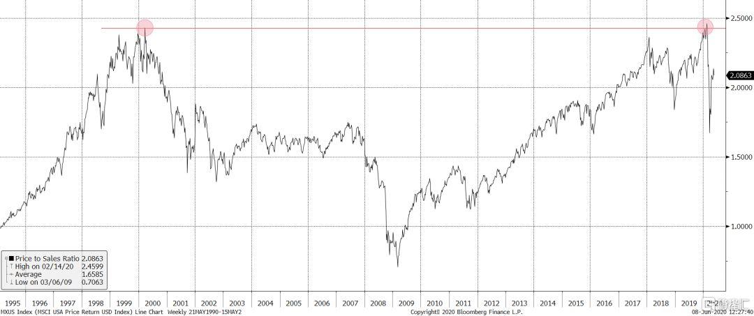 我们注意到,价值股与成长股的相对表现在2020年5月19日跌至历史低点,与2000年3月9日纳斯达克泡沫破裂时的水平相当。同样值得注意的是,从那以后直到2007年,价值一直跑赢成长。尽管价值股的回归已经令人翘首以待数年了,但是由“FANG+”(脸书、亚马逊、奈飞、谷歌、微软、苹果)领衔的成长股持续上涨,一直在挑战着市场均值回归的进程。如今,成长股正处于一个历史性的关键时刻,让人想起2000年3月互联网泡沫见顶时的情景。与此同时,MSCI美国指数的市销率在今年3月暴跌之前也达到了2000年3月的高位(图表5)。