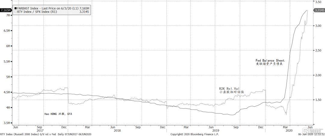 与此同时,股票交易员信奉“不与美联储作对”和“趋势投资”的交易信条。小盘股相对于标普500预期估值的高涨充分体现了市场的极端乐观情绪。自3月以来,小盘股的相对预期估值一直随着美联储扩表而飙升(图表3)。