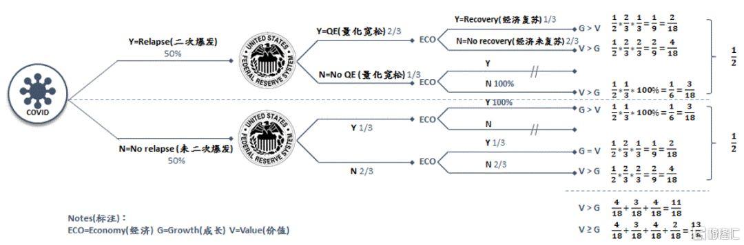 我们还可以一步一步地理清新冠疫情、美联储和实体经济是如何相互作用影响,以及对价值与成长投资的影响(图表6)。在图表6中,我们展示了各种可能的情景组合。例如,我们的决策树的第一条分支线估计,因为即使流行病学家都没有可靠的估计,新冠疫情二次爆发的几率是50/50;如果新冠疫情二次爆发,而美联储也因此加大宽松力度,那么这种情景下,经济复苏的几率估计为1/3。