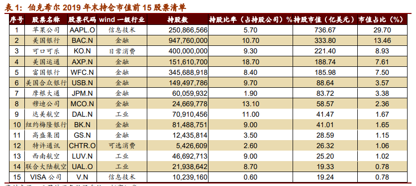 2020 年一季度,股神前五重仓股市值均大幅缩水。季报显示,一季度末,持仓市值 1807.82 亿美元,2019 年底为 2480.27 亿美元,持仓市值下降了 27.11%。季报披露显示,大约69%的持仓市值集中在五家公司,美国运通 130 亿美元、苹果公司 638 亿美元、美国银行 202 亿美元、可口可乐 177 亿美元以及富国银行 99 亿美元。相比 2019 年12月,重仓的前五只股票市值都出现了大幅缩水,相比2019年底分别减少了 31%、13%、40%、20%和47%。