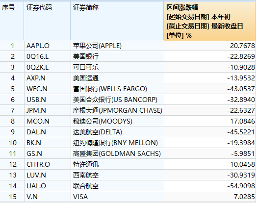 巴菲特在股东大会后完全清仓航空股,航空股目前也距离年初价格最远,达美航空、西南航空、联合航空距年初价格分别下跌45.52%、30.93%、54.90%。