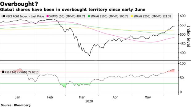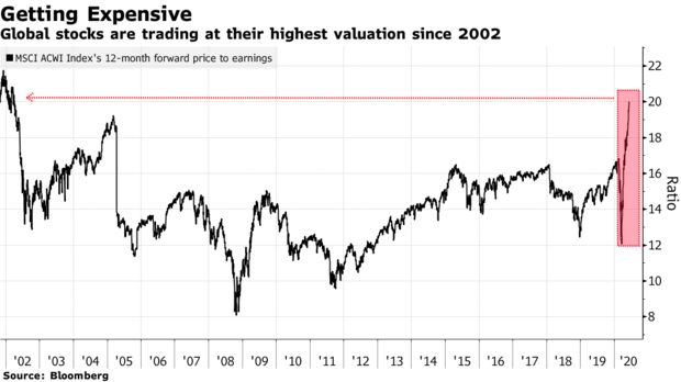 全球股市已回升至2月份冠状病毒疫情开始在全球迅速传播时的水平。摩根士丹利全球股指(ACWI)从3月份低点反弹42%,是2009年以来同期内涨幅最大的一次。该指数目前的股价是明年利润的20倍,为2002年以来最高的市盈率。