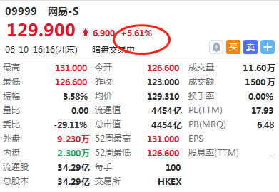 重磅新股网易暗盘交易正式开始,暗盘高开2.92%,截至16:18,报价129.9港元,涨幅5.61%,一手账面盈利690港元。最新成交额1500万港元,总市值为4454亿港元。
