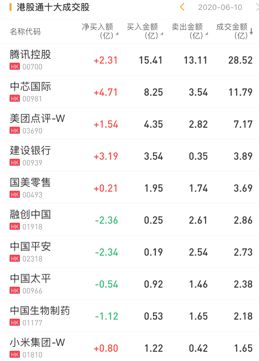 今日,南下资金净买入腾讯控股2.31亿港元,净买入中芯国际4.71亿港元,净买入建设银行3.19亿港元,净买入美团点评1.54亿港元。此外,南下资金今日净卖出融创中国2.36亿港元。