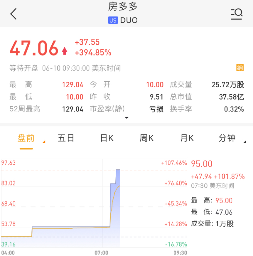 华盛资讯6月10日讯,房多多(DUO)盘前再度暴涨超100%。截止发稿,房多多涨101.87%,报95美元,当前成交量为1万股。上个交易日,房多多一度涨超12倍。