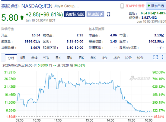 总部位于上海的在线融资平台嘉银金科的美国存托凭证(ADR)周三成交量飙升917%,盘中升至去年5月上市以来的最高水平。盘中飙涨逾900%,此前早盘大涨484.41%触发熔断而昨日收盘报2.95美元。截止今日收盘涨超96%,报5.8美元。金融界盘中大涨70.1%,最后收涨51.52%,报7.5美元。