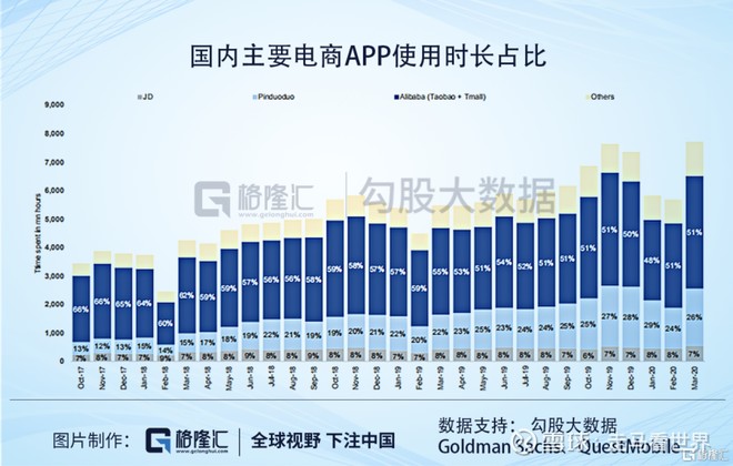 从用户使用时长上看,根据QuestMobile的数据显示,电商App使用的总时长在增加,但是淘系app时长占比从17年10月的66%下滑至2020年3月的51%,而拼多多的用户时长从17年10月的13%上升至2020年3月的26%,京东的份额一直保持在7%-8%左右。