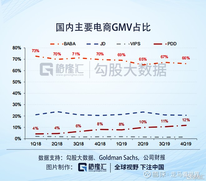 京东2019年20854亿元,拼多多10066亿,美团6800亿,微信小程序电商8000多亿,假设小程序电商交易额包含了京东拼多多美团等的小程序交易额,不含的部分算4000亿,其他杂七杂八算4000亿(光唯品会1480亿,shopee1200多亿了),一起有差不多46000亿。淘系gmv2020财年是70000亿,阿里的2020财年是2019年4月1日到2020年3月31日,实际上截止2019年底的四个季度的话是没有那么多的,2019自然年阿里巴巴的gmv大约在69000亿。如果不算国内国际的批发业务的话,则更低。以69000亿计算,双方比值来到了67%。